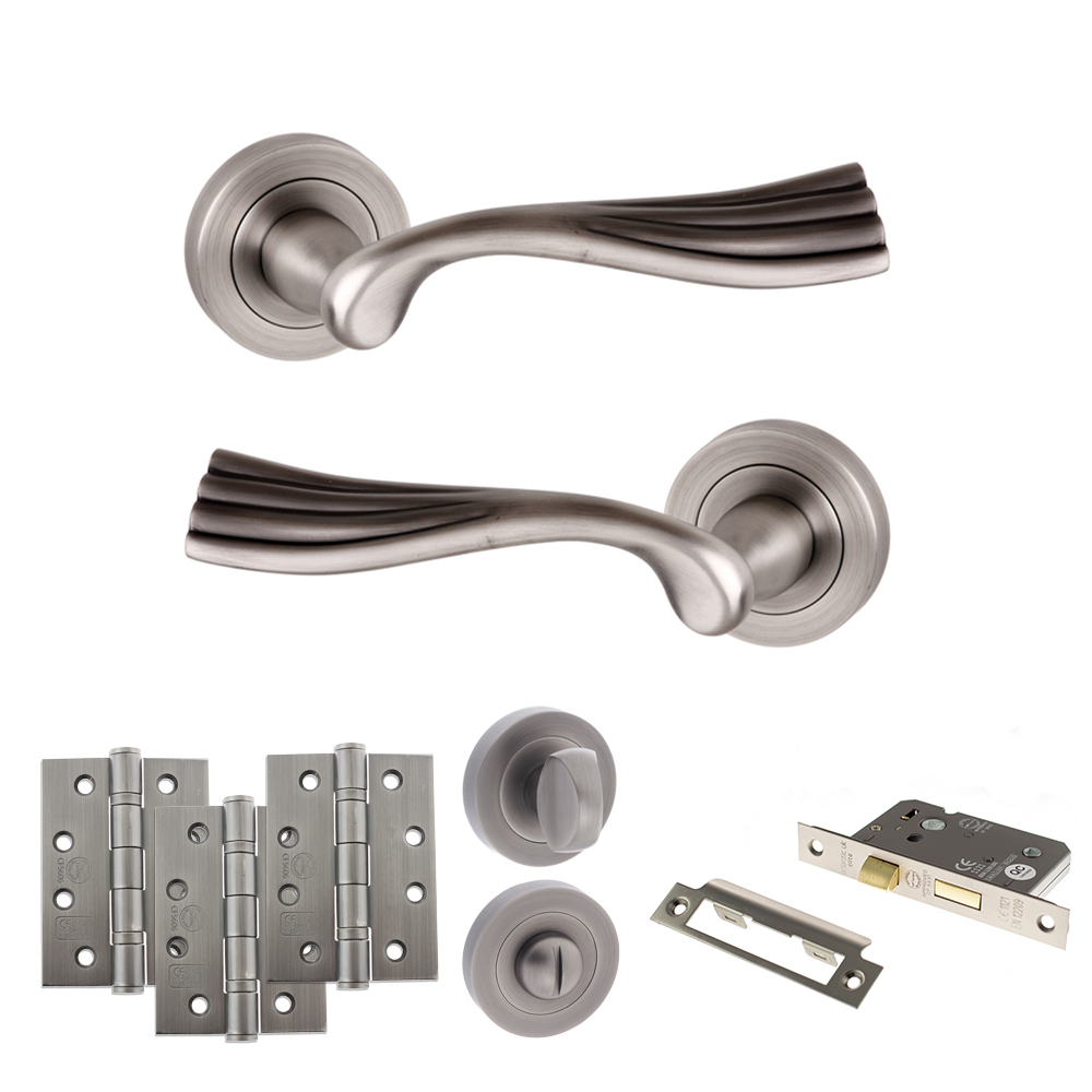Old English Richmond Door Handle Pack (Bathroom Set – 2.5″ CE Bathroom Lock, 4″ Fire Rated Hinges x3) – Distressed Silver