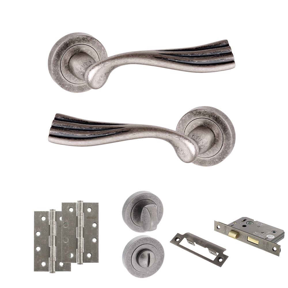Old English Richmond Door Handle Pack (Bathroom Set – 2.5″ CE Bathroom Lock, 4″ Fire Rated Hinges x3) – Distressed Silver