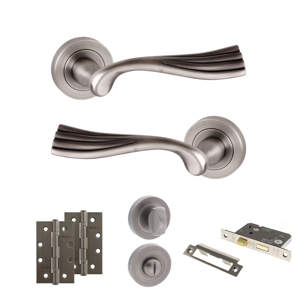 Old English Richmond Door Handle Pack (Bathroom Set – 2.5″ CE Bathroom Lock, 4″ Fire Rated Hinges x3) – Distressed Silver