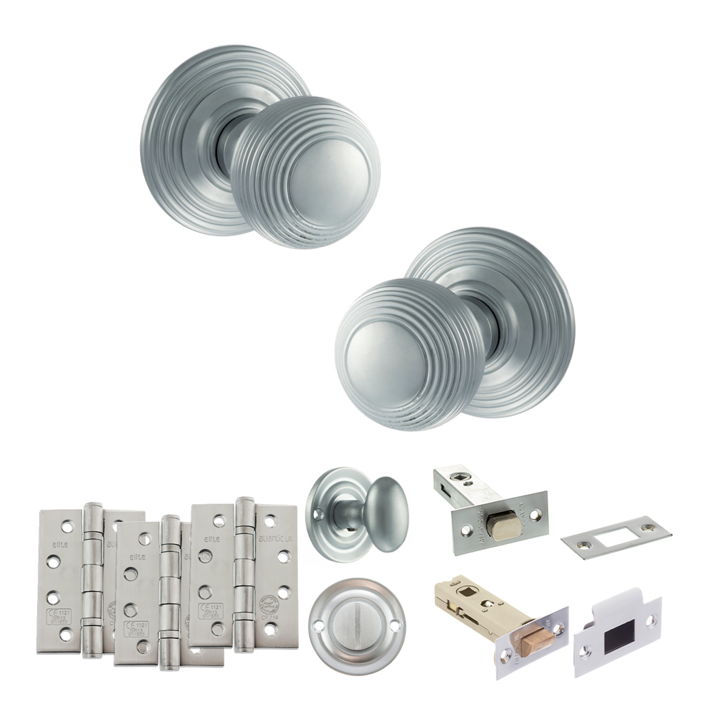 Old English Ripon Door Knob Pack (Bathroom Set - 4" Deadbolt, 4" Fire Rated Hinges x3) - Satin Chrome