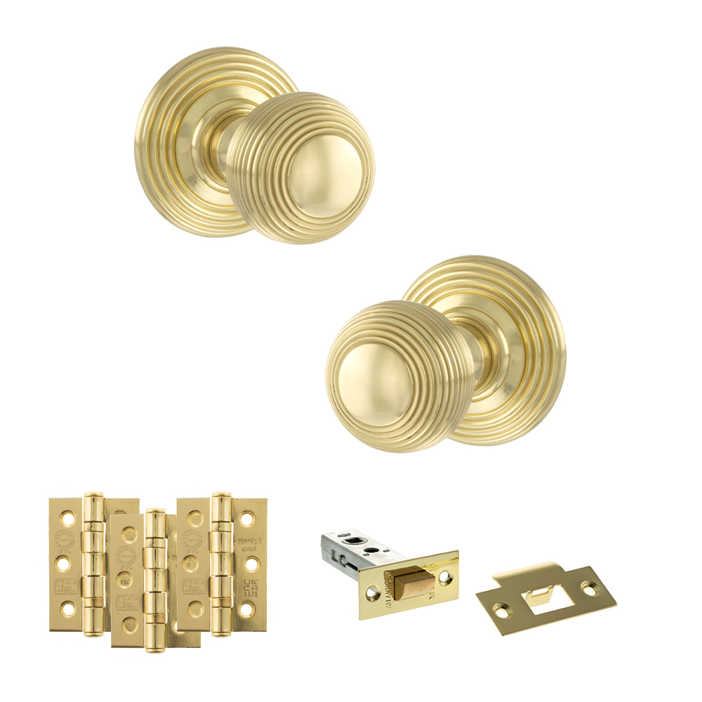 Old English Ripon Door Knob Pack (Latch Set – 3″ HD Latch, 4″ Fire Rated Hinges x3) – Polished Brass