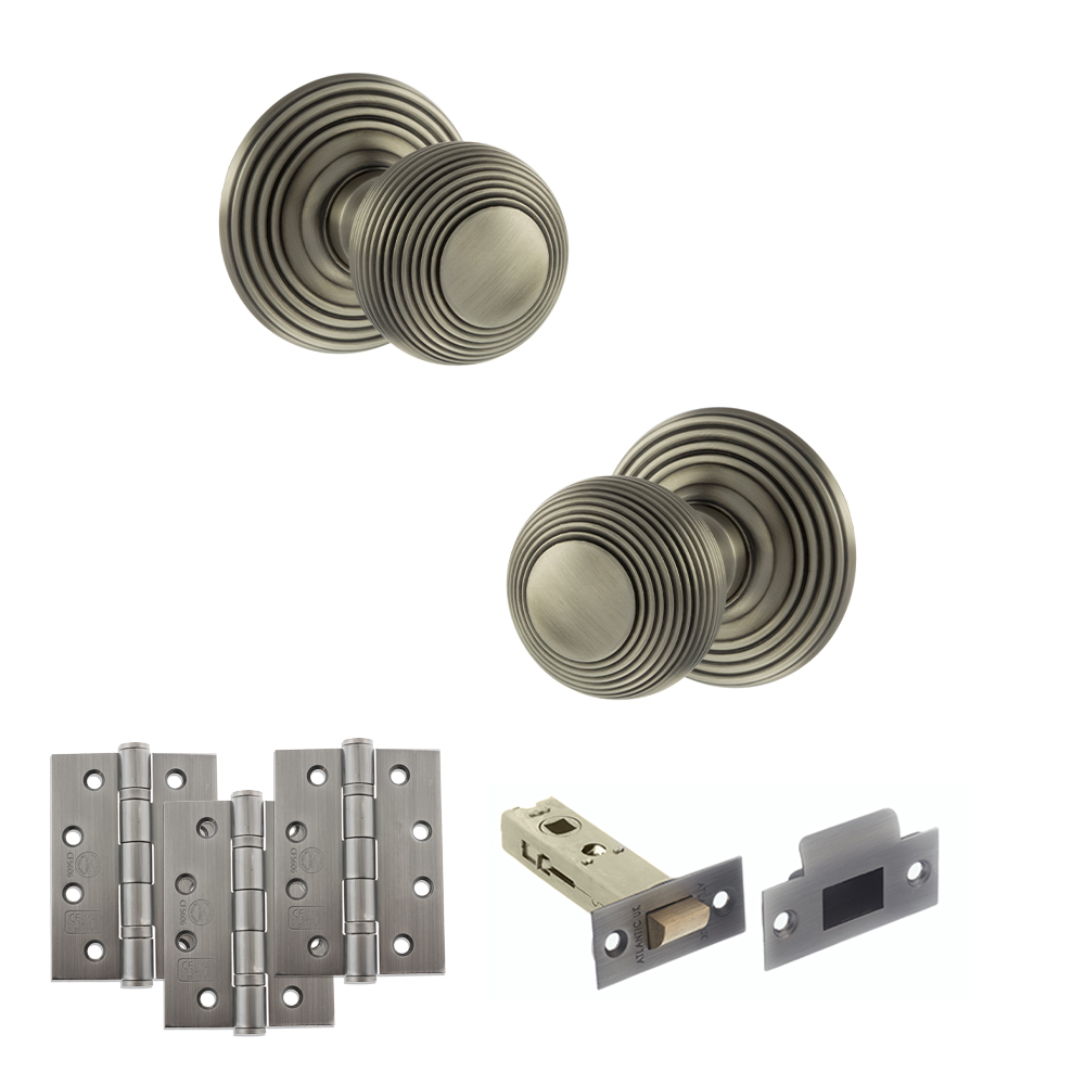 Old English Ripon Door Knob Pack (Latch Set – 4″ HD Latch, 4″ Fire Rated Hinges x3) – Matt Gun Metal