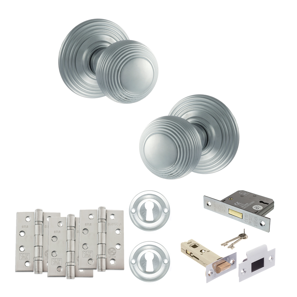 Old English Ripon Door Knob Pack (Lock Set – 3″ Latch & Deadlock, 4″ Fire Rated Hinges x3) – Satin Chrome