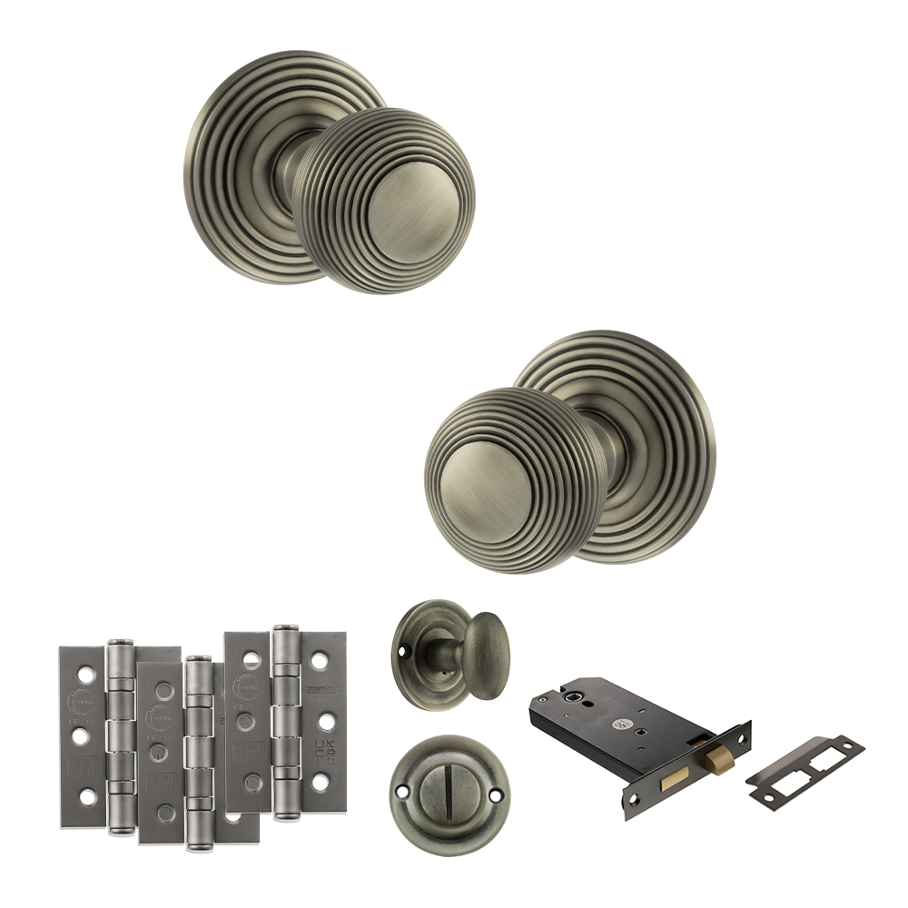 Old English Ripon Door Knob Pack (Lock Set – Horizontal Bathlock, 3″ Fire Rated Hinges x3) – Matt Gun Metal