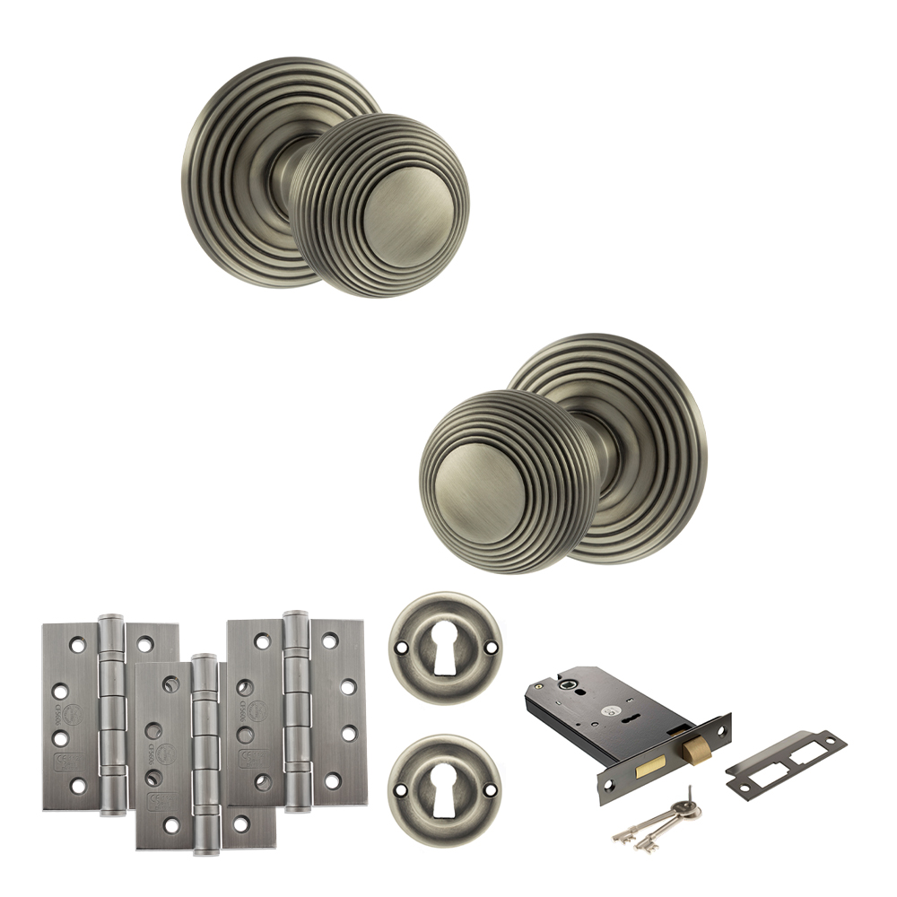 Old English Ripon Door Knob Pack (Lock Set – Horizontal Sashlock, 4″ Fire Rated Hinges x3) – Matt Gun Metal