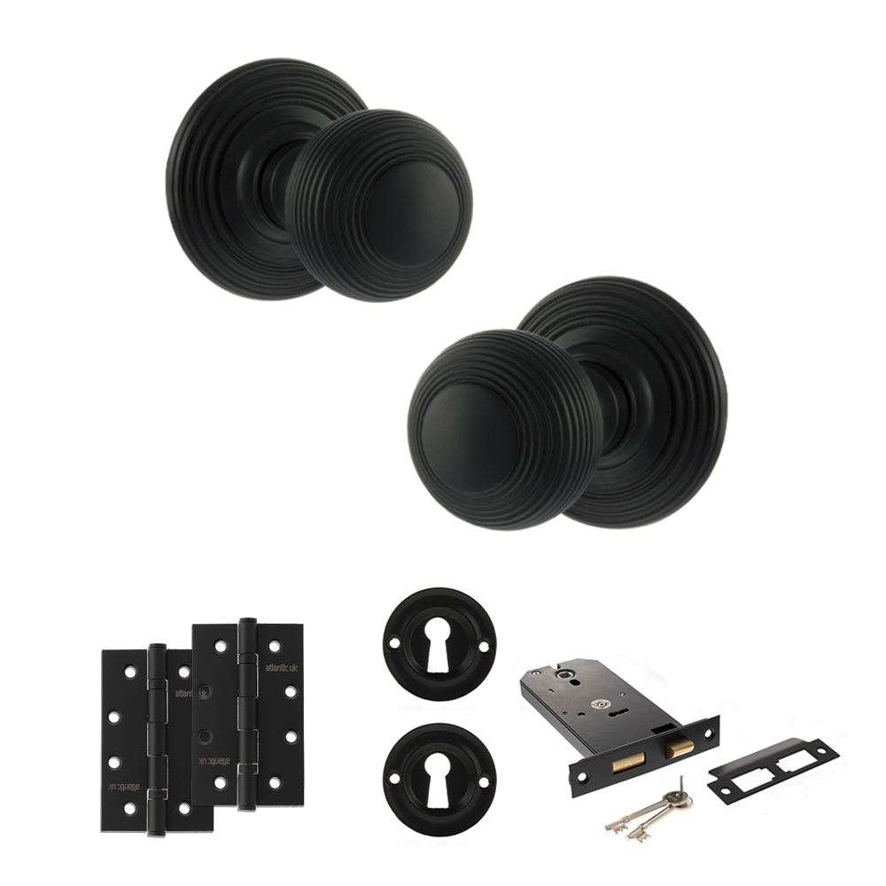 Old English Ripon Door Knob Pack (Lock Set – Horizontal Sashlock, 4″ Slim Knuckle Hinges x2) – Matt Black