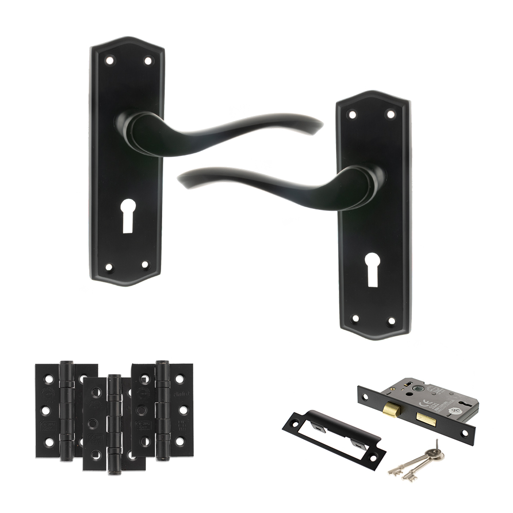 Old English Warwick Door Handle Pack (3 Lever Lock Set – 2.5″ CE Sashlock, 3″ Fire Rated Hinges x3) – Matt Black