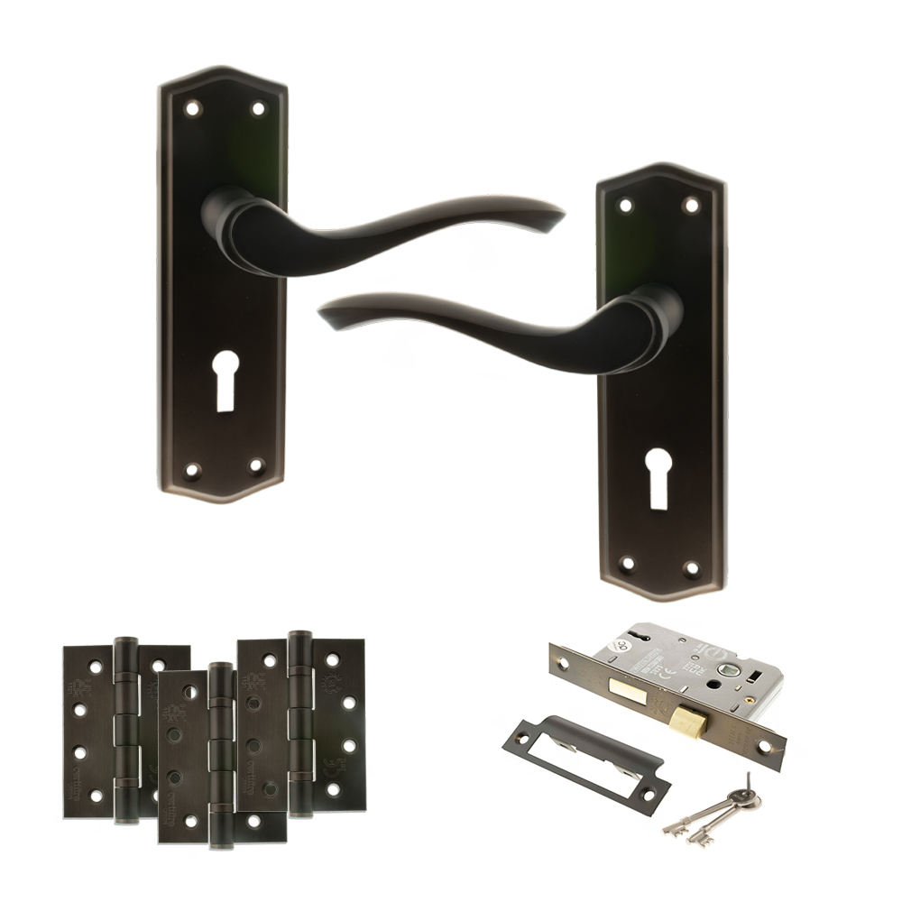 Old English Warwick Door Handle Pack (3 Lever Lock Set – 2.5″ CE Sashlock, 4″ Slim Knuckle Hinges x2) – Urban Dark Bronze
