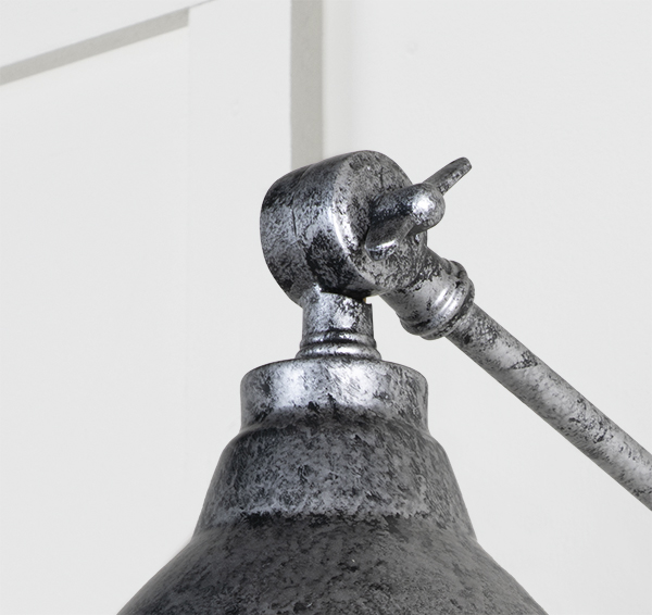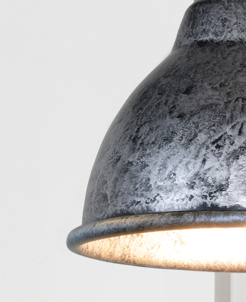 Our Brindley wall lights are as eye-catching as they are versatile, and look fantastic when paired with matching pendants. All our wall lights are made to order with a three to four week lead time. Our wall lights are only suitable for use with a 6W max. 12v LED bulb, and are not dimmable. See 51938 & 51939 for bulb options. Supplied fully wired with matching rose and all necessary fixings. Our wall lights are available in a wide range of colours and finishes. We also offer a bespoke colour service – please contact us for further information. Hand spun from solid brass and powder coated with a bespoke pewter finish, a black glaze is applied to the Pewter lights before being carefully rubbed back by hand, selectively removing it from raised areas while leaving it in the recessed and textured areas creating contrast and depth. The artisanal nature of this manufacturing tecnique means each piece is entirely unique.