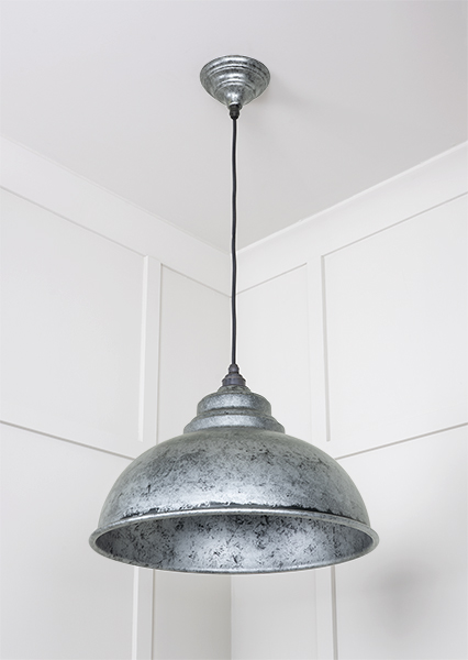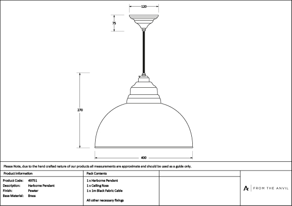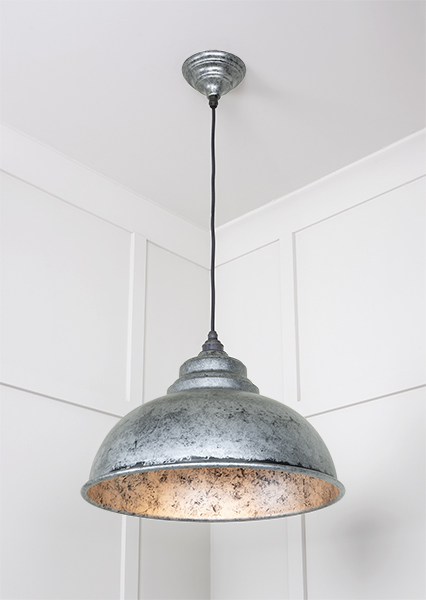Our Harborne pendants embody classic British design. Their rounded edges and unique shape will create an eye-catching focal point in any room. All our pendants are made to order with a three to four week lead time. Our light fittings are dimmable when fitted with a compatible dimmable LED bulb. Supplied fully wired with matching ceiling rose and all necessary fixings. 1m of black fabric cable provided as standard. Our pendants are available in a wide range of colours and finishes. We also offer a bespoke colour service – please contact us for further information. Hand spun from solid brass and powder coated with a bespoke pewter finish, a black glaze is applied to the Pewter lights before being carefully rubbed back by hand, selectively removing it from raised areas while leaving it in the recessed and textured areas creating contrast and depth. The artisanal nature of this manufacturing tecnique means each piece is entirely unique.