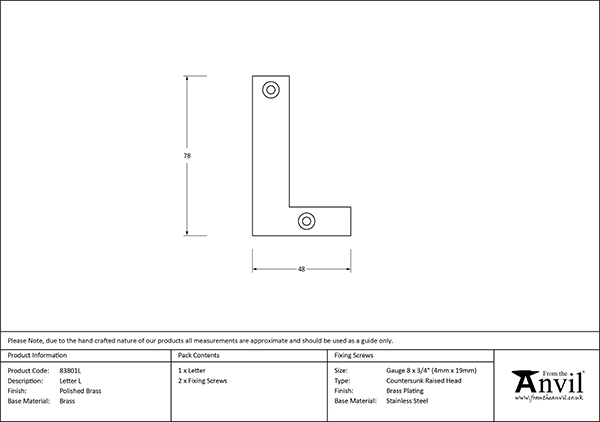 Our weighty, decorative letters will add the finishing touch to any entrance door. Sold in singles. Supplied with matching SS wood screws. Polished Brass is a simplistic, classic finish most synonymous with use in traditional period properties and interiors, yet works well paired with light colours and subtle textural details to achieve a luxurious, more modern aesthetic. Our Polished Brass products are manufactured from solid, unlacquered brass. Bright and reflective when polished, although as an unlacquered, ‘living’ finish it will continue to oxidise, meaning it will darken over time. If the product becomes too dark or tarnished, it can be polished to restore the brighter finish. Click to learn more about this Finish.