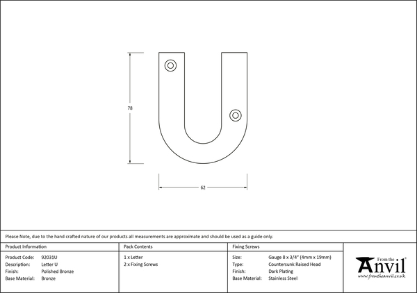 Our weighty, decorative letters will add the finishing touch to any entrance door. Sold in singles. Supplied with matching SS wood screws. Polished Bronze is a bright, highly reflective finish with an abundance of character and warmth. This finish really pops when used in contemporary settings with bold colourways, adding visual interest and contrast. Our Polished Bronze is manufactured from solid bronze containing a minimum of 85% copper. The finish is first aged, then repolished to create subtle contrast between the lighter surface areas and darker patina which gathers around the edges and recesses. To preserve the bright, reflective finish a durable lacquer is applied during the final stages of manufacturing. Bronze will naturally darken over time, however the bright reflective finish can be restored by polishing with a beeswax based furniture polish if desired. Click to learn more about this Finish.