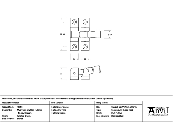 Polished Bronze Mushroom Brighton Fastener – Narrow (Square) | 46586