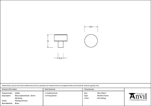 • Knob Size: 25mm Dia