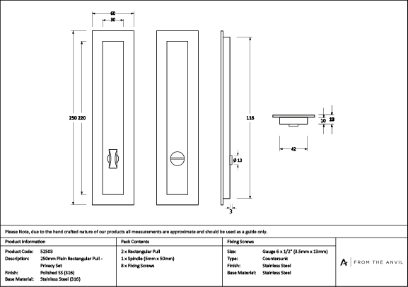 Our range of sliding door furniture is suitable for all sliding, pocket, and flush door systems. The Plain design matches a number of other products in the range. Maximum door thickness: 45mm. Longer thumbturn spindles available on request. Minimum door thickness: 35mm. Set includes 2 Rectangular pull handles and coin and release thumbturn. Can be used with a sliding door lock. Available in two sizes. Supplied with matching SS wood screws. Our Polished Marine 316 Stainless Steel is a bright, high sheen, finish well suited to a range of architectural styles. A versatile choice that looks especially striking when used against dark and dramatic hues, but also works when paired with a range of more subtle colours for a classic look. Manufactured with high concentrations of chromium and nickel, our Satin Marine Stainless Steel is grade 316 and offers extremely resilient, corrosion resistant properties, exceeding 1,000+ hours salt testing. This finish is an excellent choice for coastal locations and highly polluted environments. Click to learn more about this Finish.