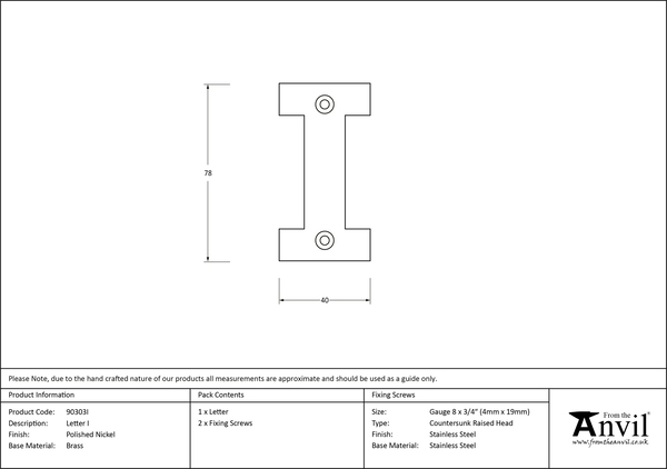 Our weighty, decorative letters will add the finishing touch to any entrance door. Sold in singles. Supplied with matching SS wood screws. Polished Nickel is an excellent choice for those looking for a bright, reflective finish with warmth. This extremely versatile finish is best suited to contemporary interiors, but can also work well in more traditional settings due to its warm calming undertones. Our Polished Nickel is a high quality chrome plating applied to solid brass. The subtle brassy undertones of this finish are a result of only one plating being applied, which offer a warmth that cannot be replicated with more modern, cooler chrome finishes. Click to learn more about this Finish.