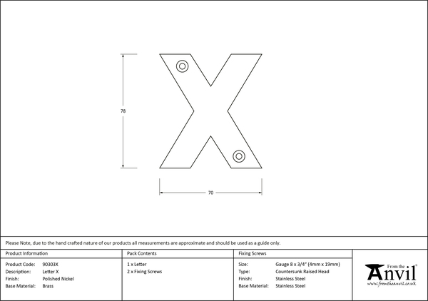 Our weighty, decorative letters will add the finishing touch to any entrance door. Sold in singles. Supplied with matching SS wood screws. Polished Nickel is an excellent choice for those looking for a bright, reflective finish with warmth. This extremely versatile finish is best suited to contemporary interiors, but can also work well in more traditional settings due to its warm calming undertones. Our Polished Nickel is a high quality chrome plating applied to solid brass. The subtle brassy undertones of this finish are a result of only one plating being applied, which offer a warmth that cannot be replicated with more modern, cooler chrome finishes. Click to learn more about this Finish.