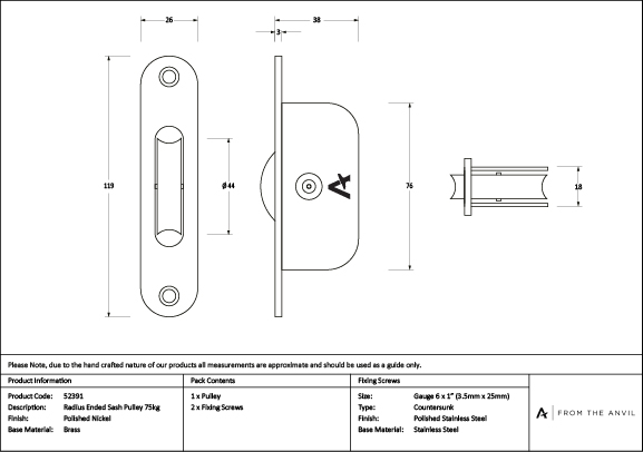 Our collection of sash furniture is available in various finishes designed to flawlessly match the rest of our products. A high-quality radiused sash pulley for heavy windows. 75Kg max sash weight per pair. The pulley utilises ball bearings to create a smooth and durable movement. 44mm (1¾†) curved wheel for use with cord up to Ø8mm. Supplied with matching SS wood screws. Polished Nickel is an excellent choice for those looking for a bright, reflective finish with warmth. This extremely versatile finish is best suited to contemporary interiors, but can also work well in more traditional settings due to its warm calming undertones. Our Polished Nickel is a high quality chrome plating applied to solid brass. The subtle brassy undertones of this finish are a result of only one plating being applied, which offer a warmth that cannot be replicated with more modern, cooler chrome finishes. Click to learn more about this Finish.