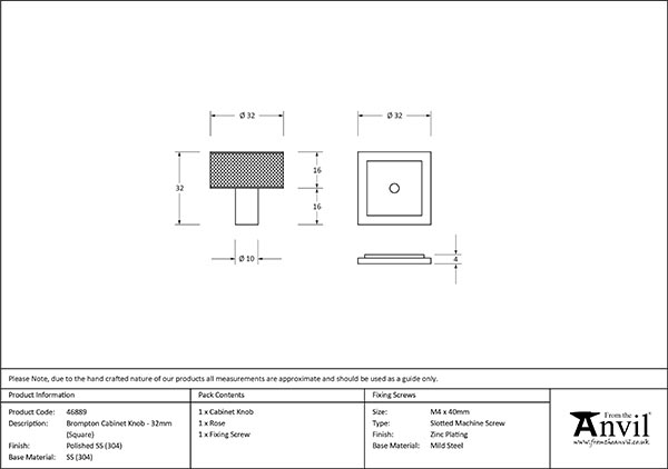 Polished SS (304) Brompton Cabinet Knob – 32mm (Square) | 46889