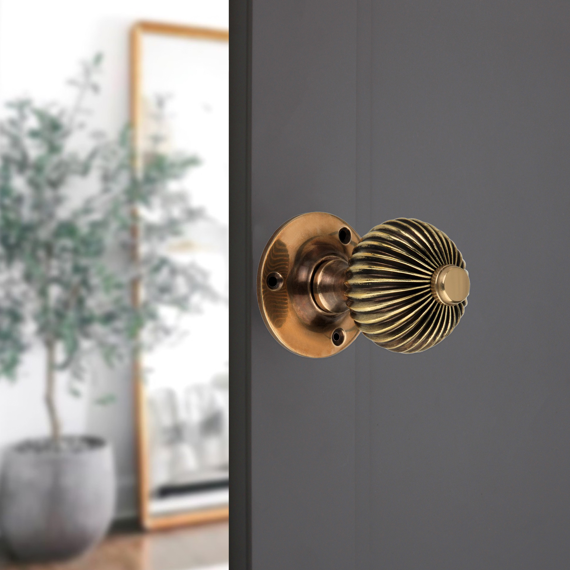 The contemporary ‘Regency Door Knob’ cast in solid brass on a unsprung attached rose with a fluted reeded design adds a luxury touch to any door popular from the Edwardian period. Featuring a rich coloured solid unlacquered brass which will continue to age down and alternatively they can easily be polished back to shiny. It maintains great flexibility, as it can be used as a mortice knob and comes in pairs.