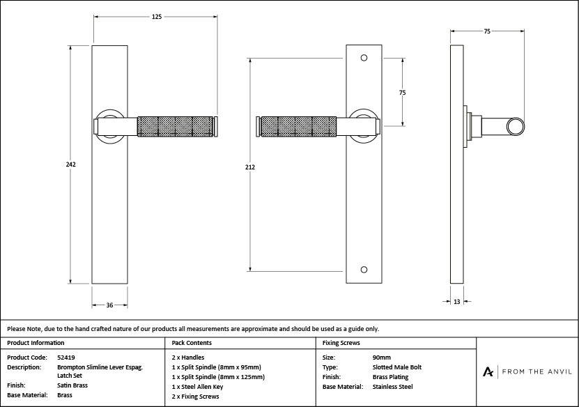 The contemporary Brompton suite features a textured, knurled surface. The industrial styling of the diamond effect creates a modern range of products that can be used throughout your property. Our Brompton lever handle range is forged from solid brass which emphasises the high quality materials and manufacturing techniques used. A perfect design choice to use throughout your property with many matching products available. This handle has a strong double spring incorporated into the stylish boss design to give both functionality & elegance. Lever handle for external doors where multi-point locking is required. Set includes an internal and external lever espag latch handle. Suitable for use with a French door kit in conjunction with a slimline lever espag. lock set and Euro cylinder. Supplied with matching SS bolt through fixings. Satin Brass offers a sophisticated and more contemporary alternative to Polished and Aged Brass. The rich, warm undertones, and matt look of this finish exude luxury and are perfect for creating a statement in any space. Best suited to more modern homes and interiors, it works well when paired with darker tones and colours. Manufactured from solid brass, our Satin Brass products are brushed with a satin wheel during the final stages of manufacturing, giving them their distinctive, matt appearance, before a high quality matt lacquer is applied to the surface for protection. Click to learn more about this Finish.