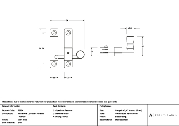 Satin Brass Mushroom Quadrant Fastener – Narrow | 52364