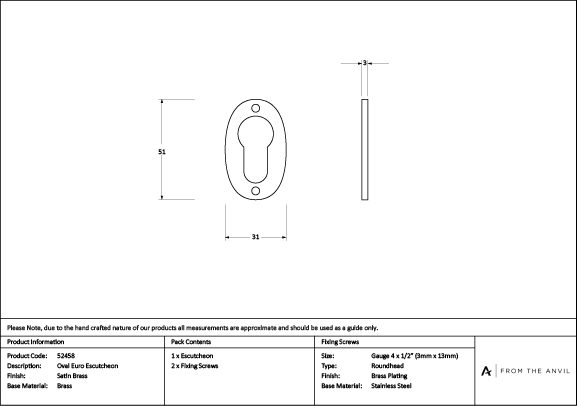 Our vast range of escutcheons are used to decorate key holes, adding the finishing touch to any locking door. Our escutcheons are designed to complement all our mortice knob and lever on rose designs. This Oval escutcheon is used with a Euro profile lock in conjunction with a Euro cylinder. Supplied with matching SS wood screws. Satin Brass offers a sophisticated and more contemporary alternative to Polished and Aged Brass. The rich, warm undertones, and matt look of this finish exude luxury and are perfect for creating a statement in any space. Best suited to more modern homes and interiors, it works well when paired with darker tones and colours. Manufactured from solid brass, our Satin Brass products are brushed with a satin wheel during the final stages of manufacturing, giving them their distinctive, matt appearance, before a high quality matt lacquer is applied to the surface for protection. Click to learn more about this Finish.