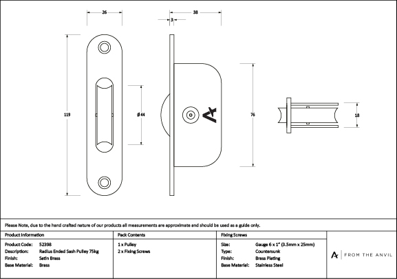 Our collection of sash furniture is available in various finishes designed to flawlessly match the rest of our products. A high-quality radiused sash pulley for heavy windows. 75Kg max sash weight per pair. The pulley utilises ball bearings to create a smooth and durable movement. 44mm (1¾†) curved wheel for use with cord up to Ø8mm. Supplied with matching SS wood screws. Satin Brass offers a sophisticated and more contemporary alternative to Polished and Aged Brass. The rich, warm undertones, and matt look of this finish exude luxury and are perfect for creating a statement in any space. Best suited to more modern homes and interiors, it works well when paired with darker tones and colours. Manufactured from solid brass, our Satin Brass products are brushed with a satin wheel during the final stages of manufacturing, giving them their distinctive, matt appearance, before a high quality matt lacquer is applied to the surface for protection. Click to learn more about this Finish.