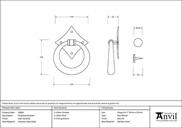 This ring door knocker shows a true masterpiece of forging. Drawn from one piece of marine grade stainless steel bar and bent to form the ring, this highlights every hammer blow by our highly skilled blacksmiths.