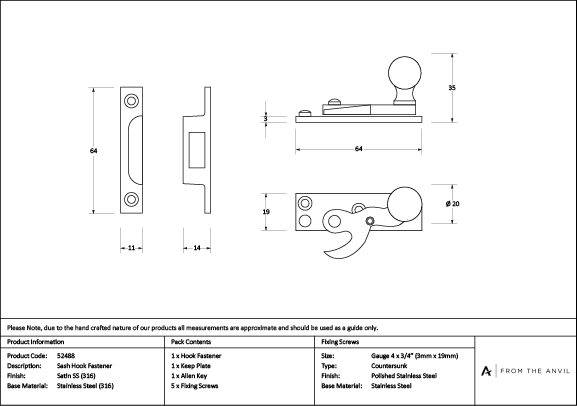 Our collection of sash furniture is available in various finishes designed to flawlessly match the rest of our products. A stylish hook fastener used to secure sash windows. The thin fixing keep makes this product ideal for use on a narrow top rail. Locking mechanism operates by way of a grub screw. Supplied with matching SS wood screws. Our Satin Marine 316 Stainless Steel products are ideal for those looking for a hardwearing, low sheen finish. its cool tones and lightly brushed surface make it distinctly contemporary, and work best when paired with lighter tones and subtle textures complementing clean, modern aesthetics. Manufactured with high concentrations of chromium and nickel, our Satin Marine Stainless Steel is grade 316 and offers extremely resilient, corrosion resistant properties, exceeding 1,000+ hours salt testing. This finish is an excellent choice for coastal locations and highly polluted environments. Click to learn more about this Finish.