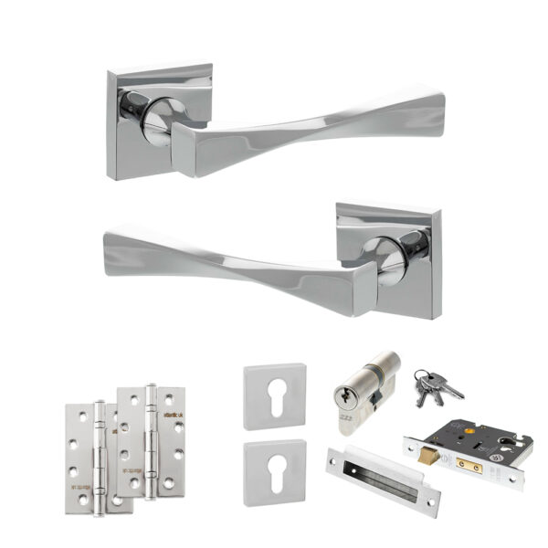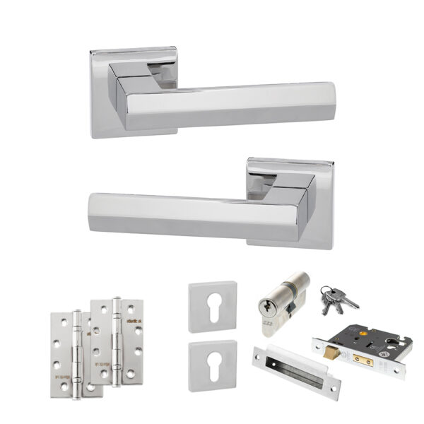 Senza Pari Davoli Door Handle Pack (Euro Lock Set – 3″ CE Sashlock, 4″ Slim Knuckle Hinges x2) – Polished Chrome