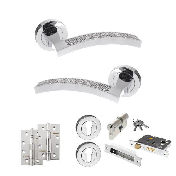 Senza Pari Crystal Door Handle Pack (Euro Lock Set – 3″ CE Sashlock, 4″ Slim Knuckle Hinges x2) – Polished Chrome