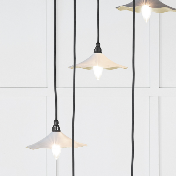 Inspired by nature, our Flora cluster pendants feature delicate curves which disperse beams of light to create a warm, soft ambience. Pair with our matching Flora wall lights and plant pots to complete the look and elevate your space. Our cluster pendants are a real statement piece. Featuring five matching pendants hung at differing heights, they are perfect for high-ceilinged entrance hallways or dining rooms. All our cluster pendants are made to order with a three to four week lead time. Overall height (from top of ceiling rose to bottom of lowest pendant) 1.3m as standard, pendant heights can be bespokely altered to your preference if needed. Our light fittings are dimmable when fitted with a compatible dimmable LED bulb. Bulb: LED Only – 6W Maximum (purchased separately) Supplied fully wired with large ceiling rose and all necessary fixings. Our cluster pendants are available in a wide range of colours and finishes. We also offer a bespoke colour service – please contact us for further information. Spun from solid brass and thoroughly polished, our Smooth Brass lights offer a luxurious final look. When lit, the sleek brass interior glistens and emits a soft, warm glow.