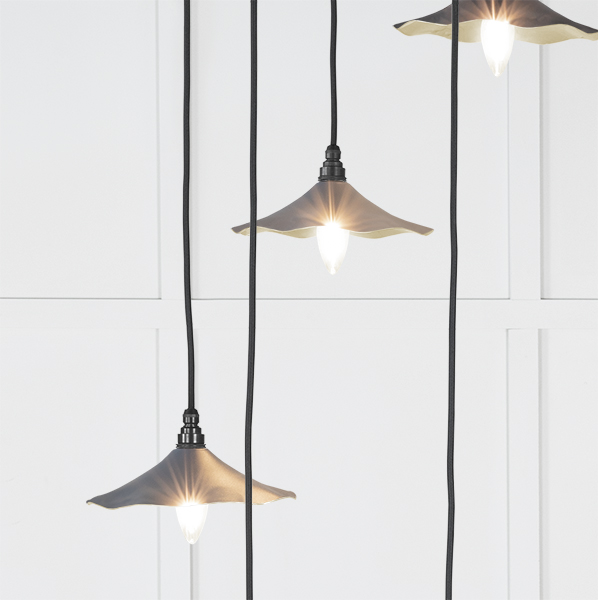 Inspired by nature, our Flora cluster pendants feature delicate curves which disperse beams of light to create a warm, soft ambience. Pair with our matching Flora wall lights and plant pots to complete the look and elevate your space. Our cluster pendants are a real statement piece. Featuring five matching pendants hung at differing heights, they are perfect for high-ceilinged entrance hallways or dining rooms. All our cluster pendants are made to order with a three to four week lead time. Overall height (from top of ceiling rose to bottom of lowest pendant) 1.3m as standard, pendant heights can be bespokely altered to your preference if needed. Our light fittings are dimmable when fitted with a compatible dimmable LED bulb. Bulb: LED Only – 6W Maximum (purchased separately) Supplied fully wired with large ceiling rose and all necessary fixings. Our cluster pendants are available in a wide range of colours and finishes. We also offer a bespoke colour service – please contact us for further information. Spun from solid brass and thoroughly polished, our Smooth Brass lights offer a luxurious final look. When lit, the sleek brass interior glistens and emits a soft, warm glow.