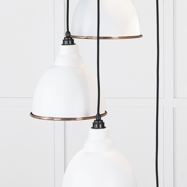 Our Brindley cluster pendants are as eye-catching as they are versatile, and look fantastic when paired with matching wall lights. Our cluster pendants are a real statement piece. Featuring five matching pendants hung at differing heights, they are perfect for high-ceilinged entrace hallways or dining rooms. All our cluster pendants are made to order with a three to four week lead time. Overall height (from top of ceiling rose to bottom of lowest pendant) 1.3m as standard, pendant heights can be bespokely altered to your preference if needed. Our light fittings are dimmable when fitted with a compatible dimmable LED bulb. Bulb: LED Only – 6W Maximum (purchased separately) Supplied fully wired with large ceiling rose and all necessary fixings. Our cluster pendants are available in a wide range of colours and finishes. We also offer a bespoke colour service – please contact us for further information. Our Smooth Copper lights are spun from solid copper. This finish produces a subtle, warm light that is best balanced by using a cooler/brighter bulb type.