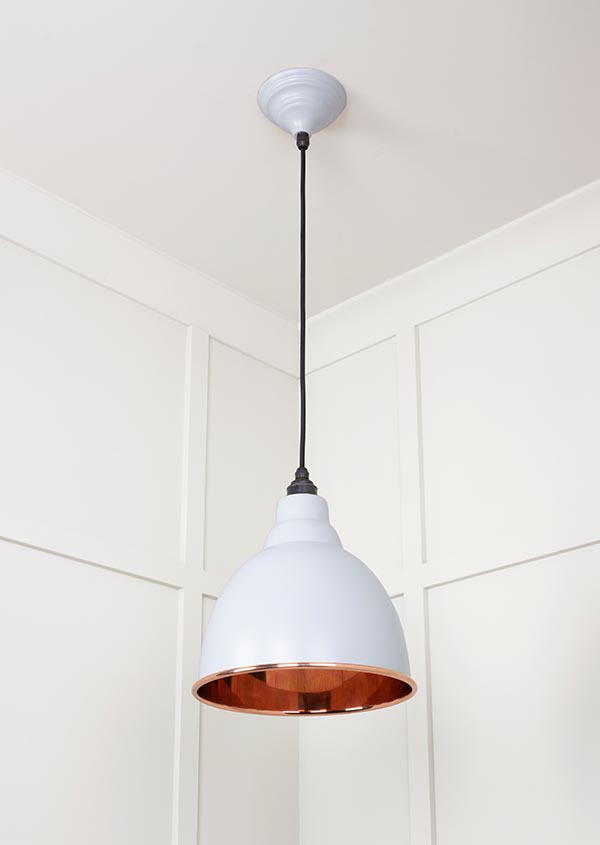 Our Brindley pendants are as eye-catching as they are versatile. Can be hung at various different levels to brighten up a space, and looks fantastic when paired with matching pendants. All our pendants are made to order with a three to four week lead time. Our light fittings are dimmable when fitted with a compatible dimmable LED bulb. Supplied fully wired with matching ceiling rose and all necessary fixings. 1m of black fabric cable provided as standard. Bulb: LED Only – 6W Maximum (purchased separately) Our pendants are available in a wide range of colours and finishes. We also offer a bespoke colour service – please contact us for further information. Our Smooth Copper pendants are spun from solid copper. This finish produces a subtle, warm light that is best balanced by using a cooler/brighter bulb type.