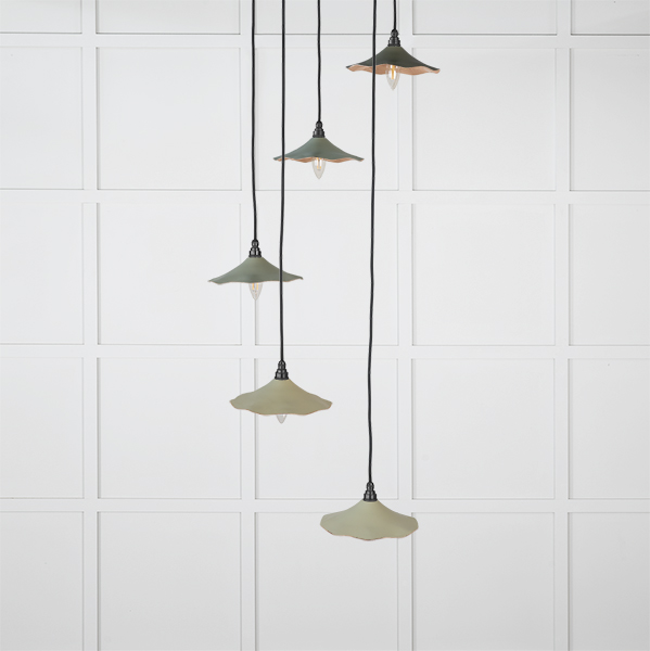 Inspired by nature, our Flora cluster pendants feature delicate curves which disperse beams of light to create a warm, soft ambience. Pair with our matching Flora wall lights and plant pots to complete the look and elevate your space. Our cluster pendants are a real statement piece. Featuring five matching pendants hung at differing heights, they are perfect for high-ceilinged entrance hallways or dining rooms. All our cluster pendants are made to order with a three to four week lead time. Overall height (from top of ceiling rose to bottom of lowest pendant) 1.3m as standard, pendant heights can be bespokely altered to your preference if needed. Our light fittings are dimmable when fitted with a compatible dimmable LED bulb. Bulb: LED Only – 6W Maximum (purchased separately) Supplied fully wired with large ceiling rose and all necessary fixings. Our cluster pendants are available in a wide range of colours and finishes. We also offer a bespoke colour service – please contact us for further information. Our Smooth Copper lights are spun from solid copper. This finish produces a subtle, warm light that is best balanced by using a cooler/brighter bulb type.
