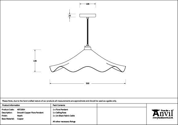Inspired by nature, our Flora pendants feature delicate curves which disperse beams of light to create a warm, soft ambience. Pair with our matching Flora wall lights and plant pots to complete the look and elevate your space. All our pendants are made to order with a three to four week lead time. Our light fittings are dimmable when fitted with a compatible dimmable LED bulb. Bulb: LED Only – 6W Maximum (purchased separately) Supplied fully wired with matching ceiling rose and all necessary fixings. 1m of black fabric cable provided as standard. Our pendants are available in a wide range of colours and finishes. We also offer a bespoke colour service – please contact us for further information. Our Smooth Copper lights are spun from solid copper. This finish produces a subtle, warm light that is best balanced by using a cooler/brighter bulb type.