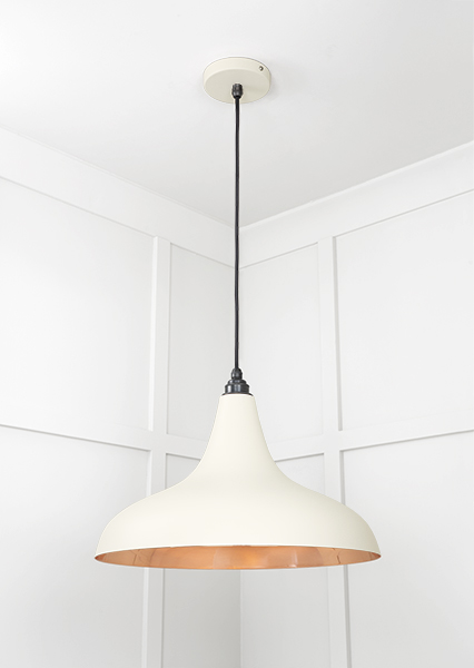 With their sleek, contemporary design, our Frankley pendants are incredibly versatile, creating an eye-catching statement in any interior. Hang individually or in a group to completely transform your space. All our pendants are made to order with a three to four week lead time. Our light fittings are dimmable when fitted with a compatible dimmable LED bulb. Bulb: LED Only – 6W Maximum (purchased separately) Supplied fully wired with matching ceiling rose and all necessary fixings. 1m of black fabric cable provided as standard. Our pendants are available in a wide range of colours and finishes. We also offer a bespoke colour service – please contact us for further information. Our Smooth Copper lights are spun from solid copper. This finish produces a subtle, warm light that is best balanced by using a cooler/brighter bulb type.