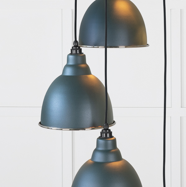 Our Brindley cluster pendants are as eye-catching as they are versatile, and look fantastic when paired with matching wall lights. Our cluster pendants are a real statement piece. Featuring five matching pendants hung at differing heights, they are perfect for high-ceilinged entrance hallways or dining rooms. All our cluster pendants are made to order with a three to four week lead time. Overall height (from top of ceiling rose to bottom of lowest pendant) 1.3m as standard, pendant heights can be bespokely altered to your preference if needed. Our light fittings are dimmable when fitted with a compatible dimmable LED bulb. Bulb: LED Only – 6W Maximum (purchased separately) Supplied fully wired with large ceiling rose and all necessary fixings. Our cluster pendants are available in a wide range of colours and finishes. We also offer a bespoke colour service – please contact us for further information. Our Smooth Nickel lights are spun from solid brass and plated in nickel. This sleek, contemporary finish creates beautifully unexpected reflections.