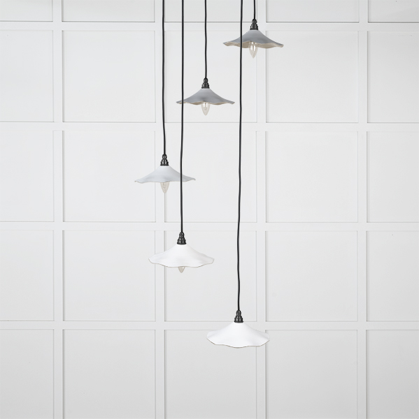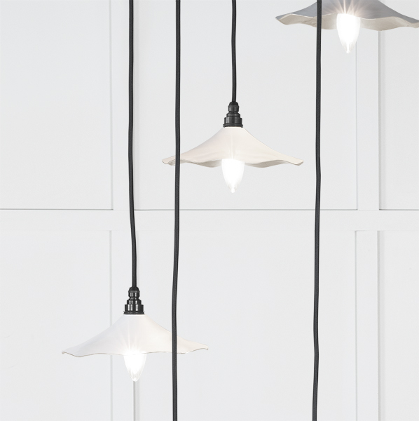 Inspired by nature, our Flora cluster pendants feature delicate curves which disperse beams of light to create a warm, soft ambience. Pair with our matching Flora wall lights and plant pots to complete the look and elevate your space. Our cluster pendants are a real statement piece. Featuring five matching pendants hung at differing heights, they are perfect for high-ceilinged entrance hallways or dining rooms. All our cluster pendants are made to order with a three to four week lead time. Overall height (from top of ceiling rose to bottom of lowest pendant) 1.3m as standard, pendant heights can be bespokely altered to your preference if needed. Our light fittings are dimmable when fitted with a compatible dimmable LED bulb. Bulb: LED Only – 6W Maximum (purchased separately) Supplied fully wired with large ceiling rose and all necessary fixings. Our cluster pendants are available in a wide range of colours and finishes. We also offer a bespoke colour service – please contact us for further information. Our Smooth Nickel lights are spun from solid brass and plated in nickel. This sleek, contemporary finish creates beautifully unexpected reflections.