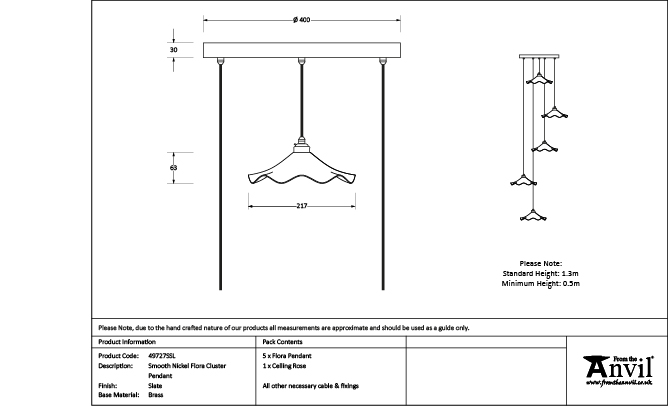 Inspired by nature, our Flora cluster pendants feature delicate curves which disperse beams of light to create a warm, soft ambience. Pair with our matching Flora wall lights and plant pots to complete the look and elevate your space. Our cluster pendants are a real statement piece. Featuring five matching pendants hung at differing heights, they are perfect for high-ceilinged entrance hallways or dining rooms. All our cluster pendants are made to order with a three to four week lead time. Overall height (from top of ceiling rose to bottom of lowest pendant) 1.3m as standard, pendant heights can be bespokely altered to your preference if needed. Our light fittings are dimmable when fitted with a compatible dimmable LED bulb. Bulb: LED Only – 6W Maximum (purchased separately) Supplied fully wired with large ceiling rose and all necessary fixings. Our cluster pendants are available in a wide range of colours and finishes. We also offer a bespoke colour service – please contact us for further information. Our Smooth Nickel lights are spun from solid brass and plated in nickel. This sleek, contemporary finish creates beautifully unexpected reflections.