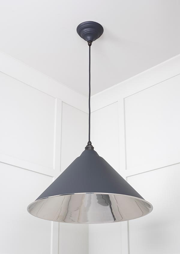 Our Hockley pendants have a sleek silhouette that brings drama to any space. They look fantastic individually, or can be combined to create further interest. All our pendants are made to order with a three to four week lead time. Our light fittings are dimmable when fitted with a compatible dimmable LED bulb. Supplied fully wired with matching ceiling rose and all necessary fixings. 1m of black fabric cable provided as standard. Bulb: LED Only – 6W Maximum (purchased separately) Our pendants are available in a wide range of colours and finishes. We also offer a bespoke colour service – please contact us for further information. Our Smooth Nickel pendants are spun from solid brass and plated in nickel. This sleek, contemporary finish creates beautifully unexpected reflections.