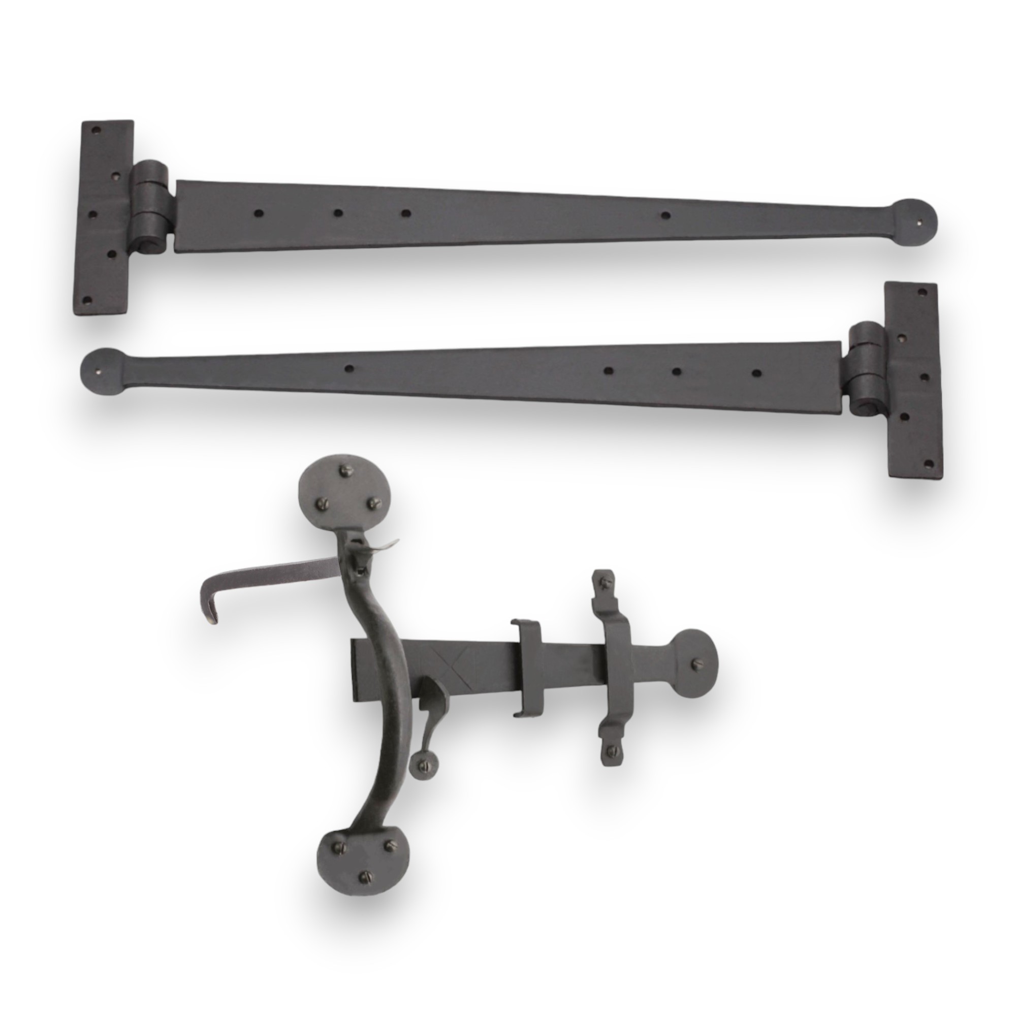 These beautiful ‘Standard Handforged Kit’ are traditionally made and forge-blackened with a beeswax finish. An authentic complement for period homes, barn conversions, cottages and for restoration projects. Each kit comes with matching screws to make for an easy installation and with 2 x 455mm steel strap hinges with penny end detail, and one thumb latch set with locking pin. Suitable for interior use. Ideal for Ledge and Brace cottage doors.