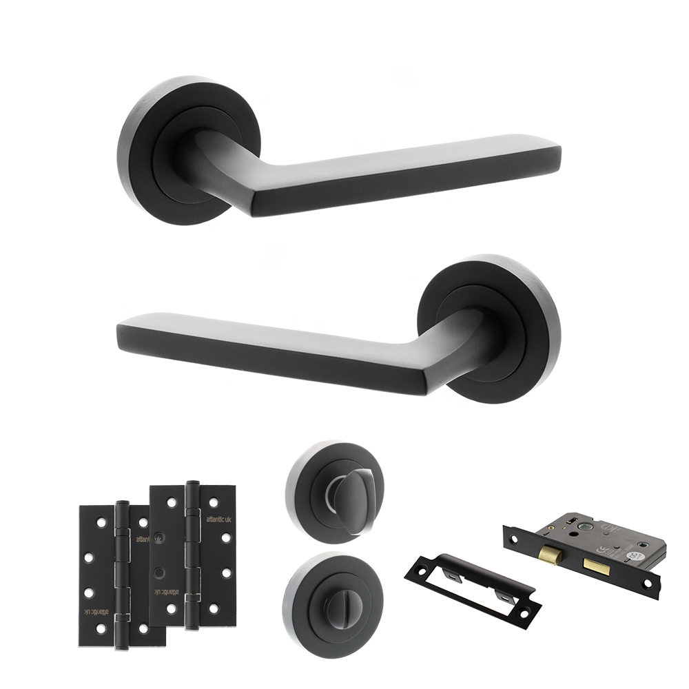 STATUS Alaska Door Handle Pack (Bathroom Set – 2.5″ CE Bathroom Lock, 4″ Fire Rated Hinges x3) – Matt Black