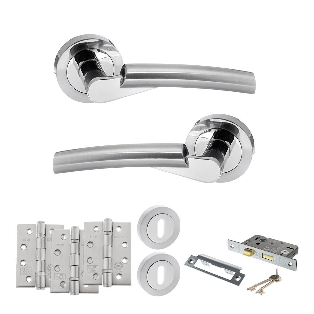 STATUS Florida Door Handle Pack (3 Lever Lock Set – 2.5″ CE Sashlock, 4″ Fire Rated Hinges x3) – Satin Chrome/Polished Chrome