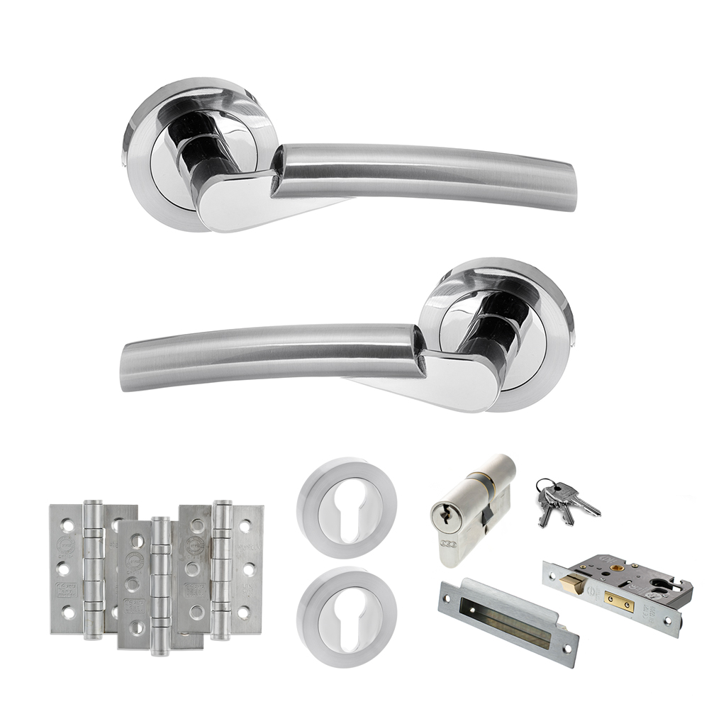 STATUS Florida Door Handle Pack (Euro Lock Set – 3″ CE Sashlock, 3″ Fire Rated Hinges x3) – Satin Chrome/Polished Chrome