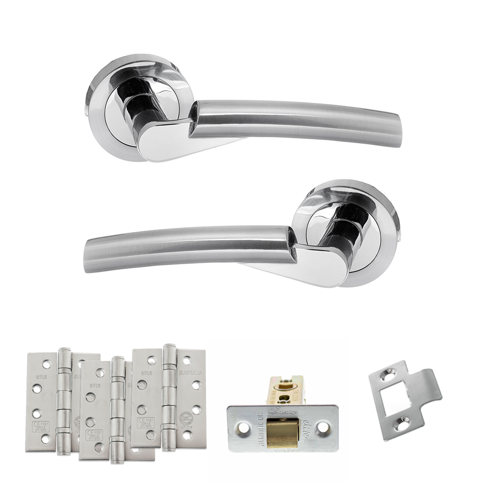 STATUS Florida Door Handle Pack (Latch Set – 2.5″ CE Latch, 4″ Fire Rated Hinges x3) – Satin Chrome/Polished Chrome