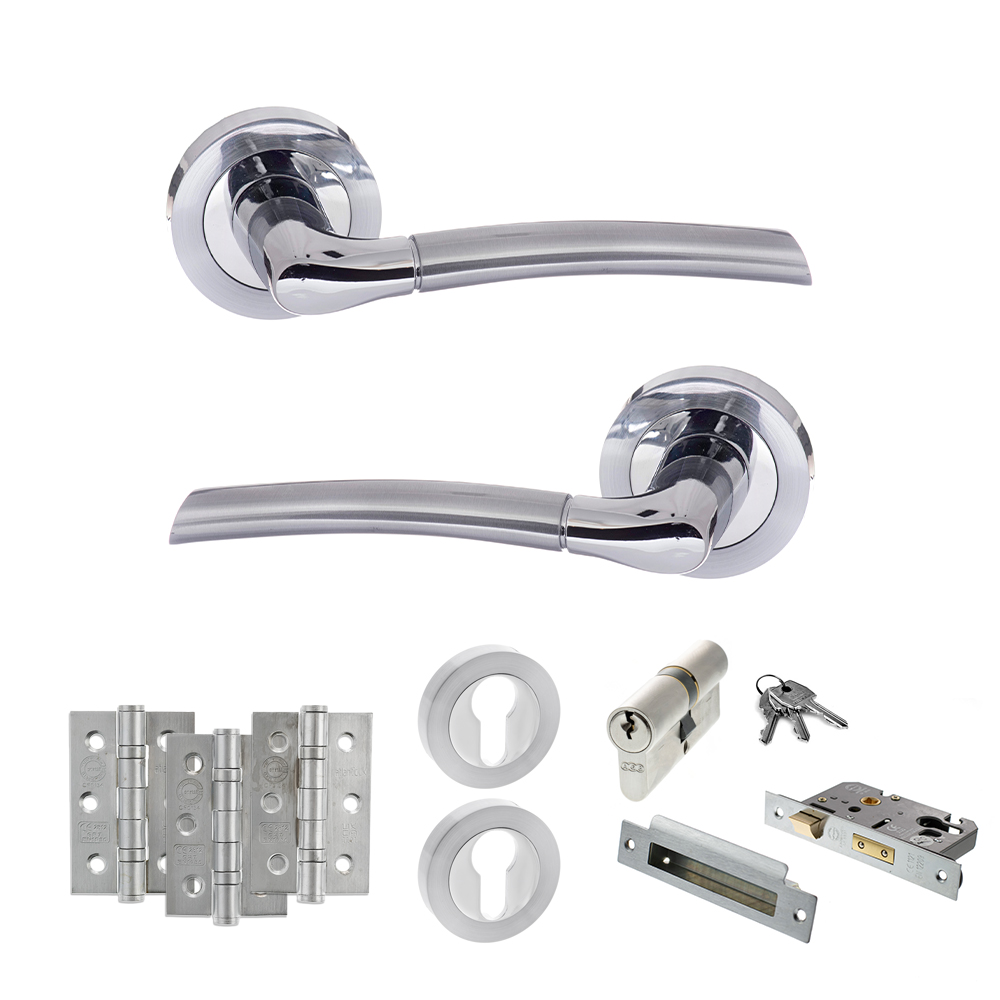 STATUS Indiana Door Handle Pack (Euro Lock Set – 3″ CE Sashlock, 3″ Fire Rated Hinges x3) – Satin Chrome/Polished Chrome