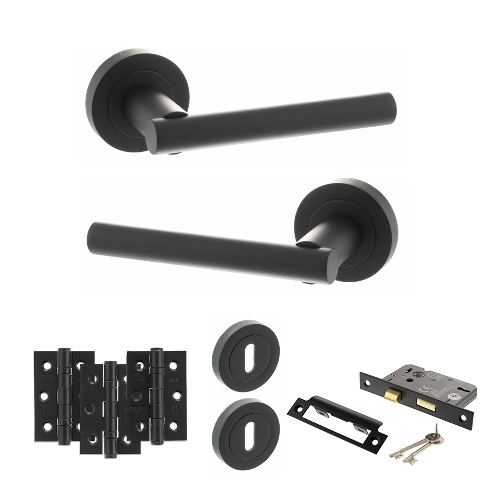 STATUS Nebraska Door Handle Pack (3 Lever Lock Set - 3" CE Sashlock, 3" Fire Rated Hinges x3) - Matt Black